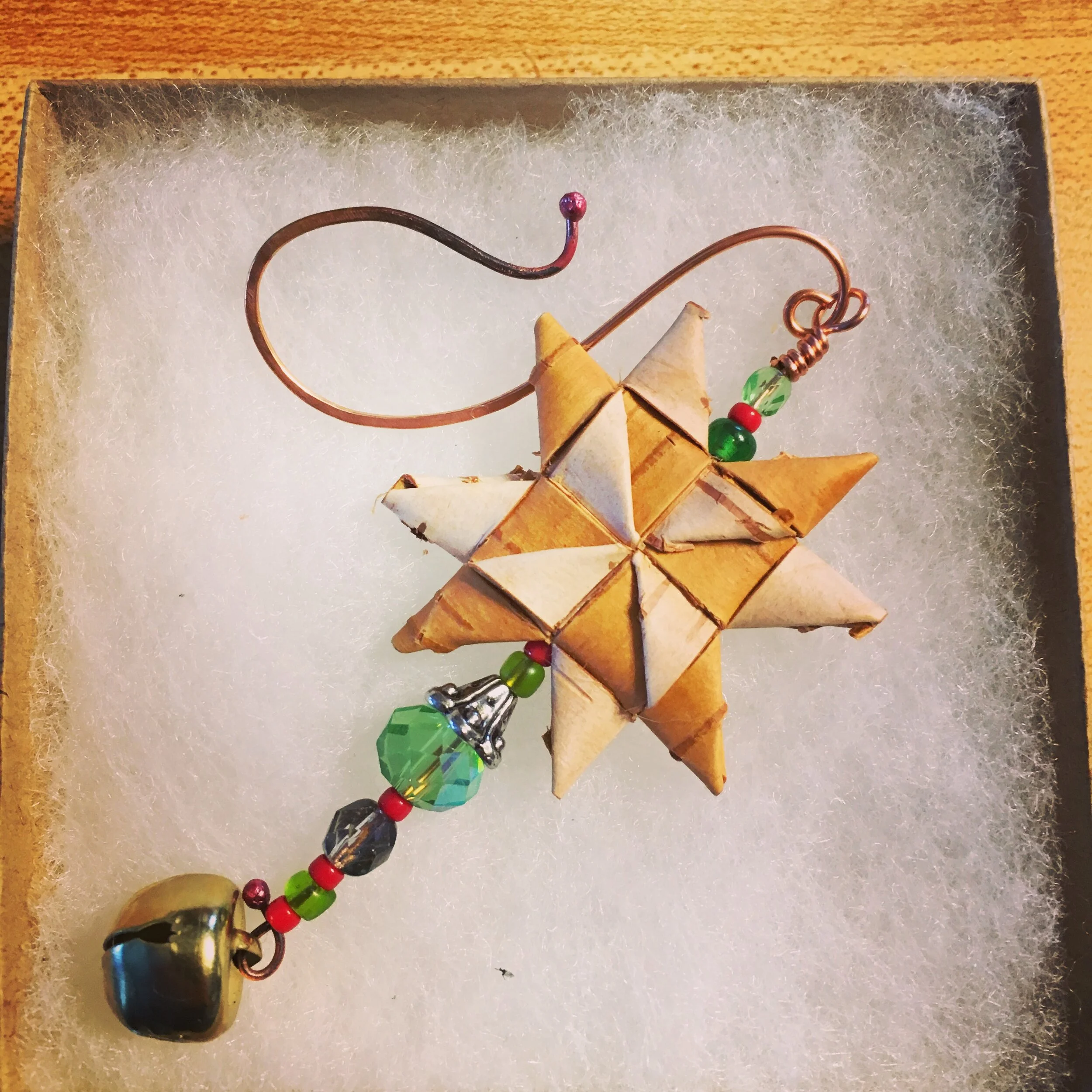 Inspired by traditional Scandinavian birch bark designs, I include hand-forged copper findings and a variety of beads to create an heirloom quality ornament.